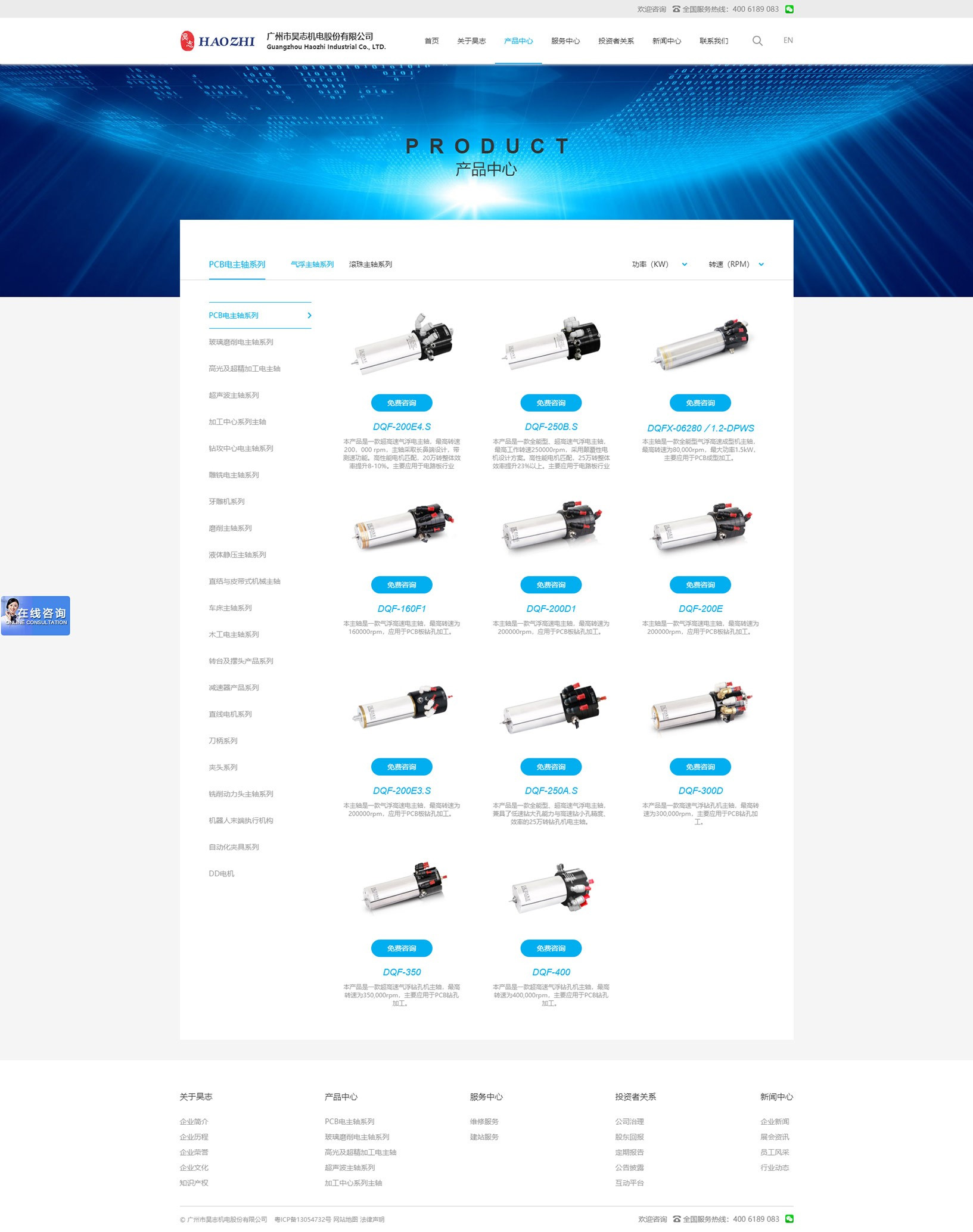 昊志機電 “以中高端數(shù)控機床及機器人核心功能部件、新能源汽車和節(jié)能環(huán)保領域的燃料電池壓縮機、曝氣鼓風機、直驅(qū)類高速風機等產(chǎn)品為核心,以精密零配件制造為支撐,以配套維修服務為特色”,通過堅持不懈的技術攻關和持之以恒的品質(zhì)管理,構(gòu)建了數(shù)控機床和機器人核心功能部件及新能源汽車和節(jié)能環(huán)保領域的核心功能部件等業(yè)務板塊。為滿足不同應用領域的使用需求,昊志機電設計研制了包括PCB鉆孔機/成型機/劃片機電主軸、數(shù)控金屬/玻璃雕銑機電主軸、數(shù)控車床主軸/電主軸、走芯車床電主軸、直結(jié)與皮帶式機械主軸、加工中心電主軸、鉆攻中心電主軸、高速內(nèi)/外圓磨床主軸、木工雕銑機電主軸、高光及超精加工電主軸、超聲波電主軸、液靜壓主軸、銑削動力頭、末端執(zhí)行機構(gòu)、刀柄夾頭、數(shù)控轉(zhuǎn)臺、直線電機、諧波減速器、燃料電池壓縮機、曝氣鼓風機、直驅(qū)類高速風機等數(shù)十個系列上百種產(chǎn)品,并穩(wěn)步向其他核心功能部件行業(yè)擴張。