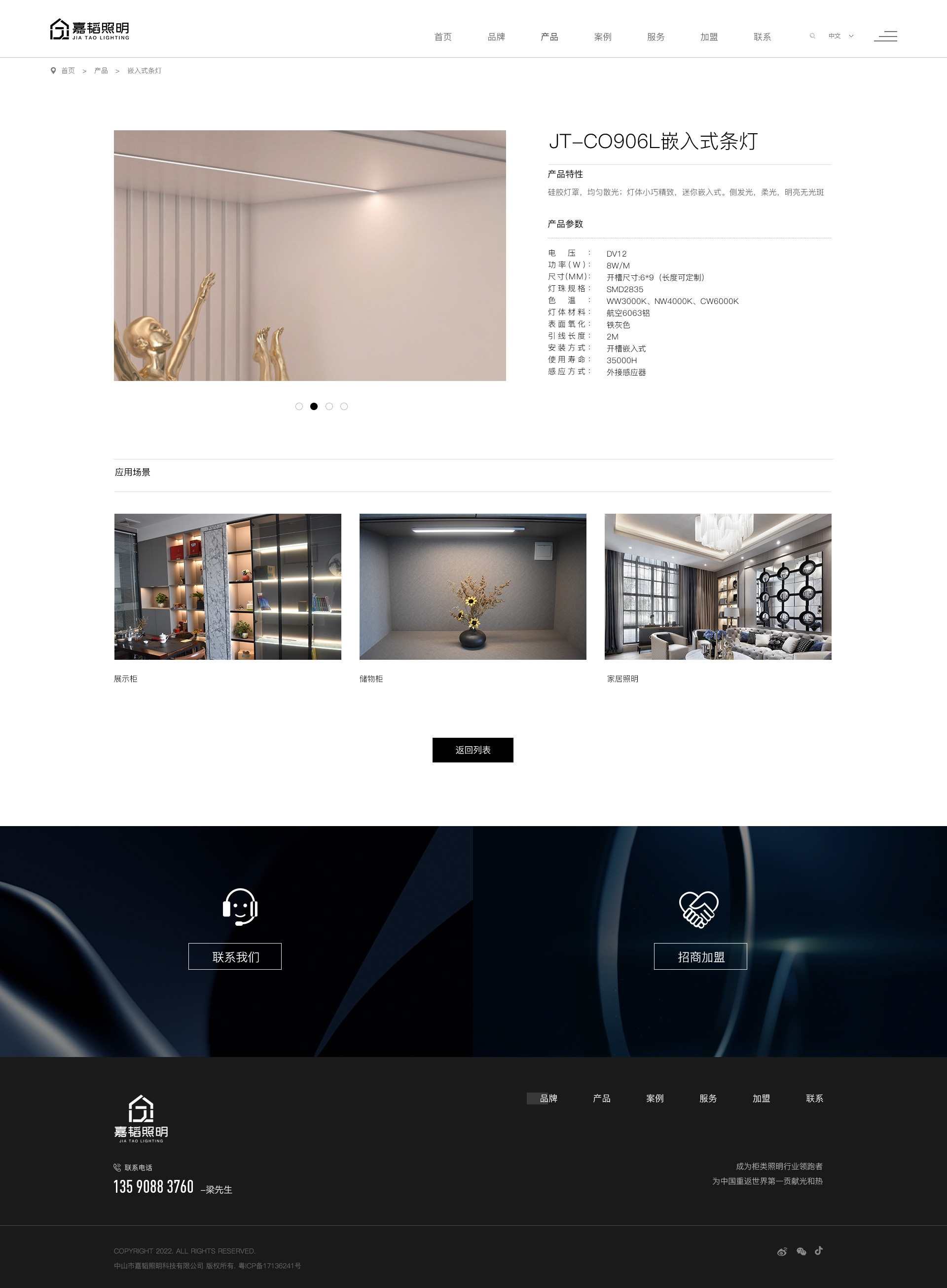 中山市嘉韜照明科技有限公司成立于2014年。專為全屋定制家居、廚柜、展示柜等客戶提供局部照明的系統(tǒng)化解決方案。是一家集研發(fā)、生產(chǎn)、銷(xiāo)售、服務(wù)為一體的現(xiàn)代化企業(yè)。通過(guò)ISO9001產(chǎn)品質(zhì)量管理體系認(rèn)證、IS114001環(huán)境管理體系認(rèn)證。并擁有多項(xiàng)研發(fā)專利及相關(guān)國(guó)內(nèi)外資質(zhì)認(rèn)證。商品遠(yuǎn)銷(xiāo)歐美,東南亞及非洲等多個(gè)國(guó)家和地區(qū)。